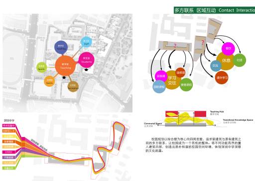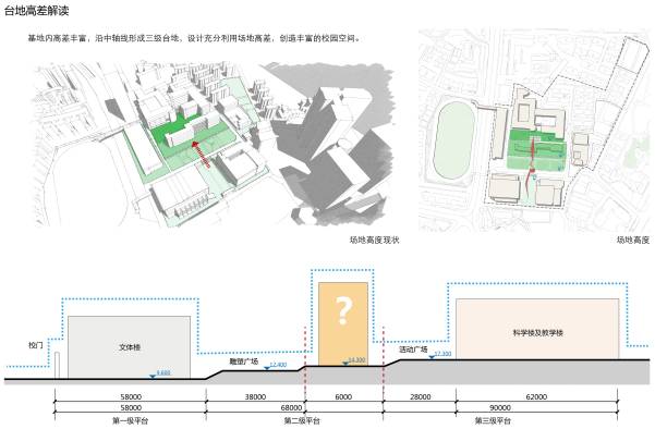 通过顺应基地景观轴,不同标高场景切换,综合楼西面首层架空,满足学生课外活动,更好地与生活区联系;