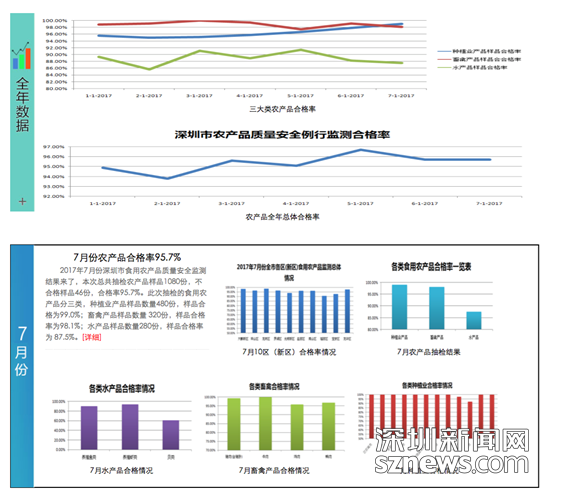 目前,深圳市场上的农产品95%来自于外地,如此大的供应量对深圳的食品安全带来了挑战。所以,对食用农产品的快检每天都会进行,当天就会检测出结果,如有不合格的批次会立刻销毁。而针对猪肉及蔬菜的定量抽检,也增加至具体的每4天发布一次。抽检信息公示专题根据市民所需,将每天的快检情况及销毁情况突出展示,为了让市民能更直观的了解到抽检结果,也把数据变化做成了线形图,让市民能够一目了然的了解当月,乃至全年的抽检情况。