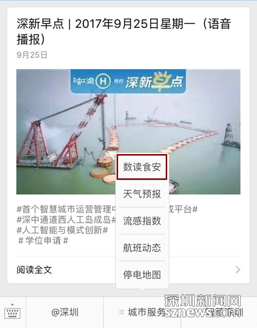 市民通过访问深圳新闻网首页点击该公示专题栏(http://news.sznews.com/node_233086.htm),或通过点击深圳新闻网微信公众号中的“城市服务”一栏中的“数读食安”均可进入专题页面。而深圳新闻网的官方微博也会及时发布最新的抽检数据。