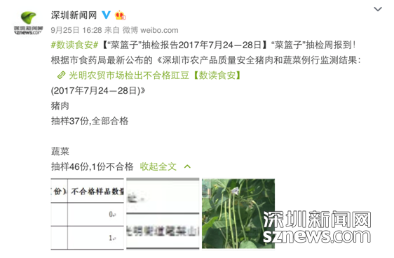 深圳新闻网讯(记者 胡津玮)“民以食为天,食以安为先”。食品是人类赖以生存和发展的基本物质条件,食品安全更是涉及人类最基本权利的保障。今年,深圳市食品药品监督管理局联合深圳新闻网,上线了“深圳食品及食用农产品监督抽查信息公示”专题网页,把每一次抽检数据都以直观的方式向大众公示,让市民及时了解深圳食品抽检情况,使深圳的食品安全建设工作更加透明公开。