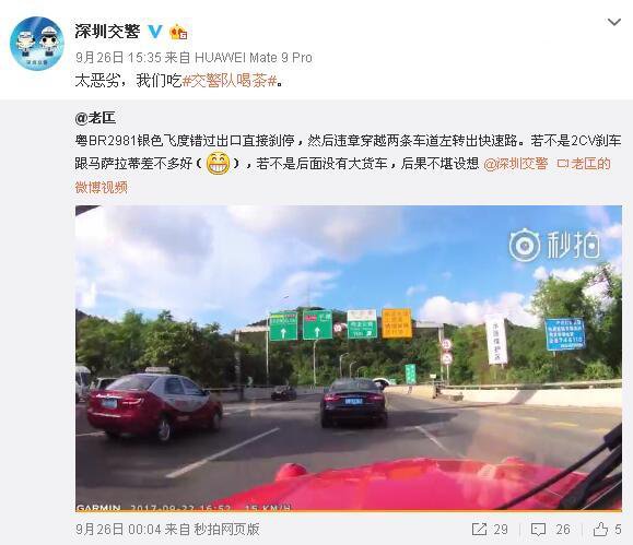 26日00:04,网友@老匞在微博上发布其用行车记录仪拍到的危险一幕:粤BR2981银色飞度错过出口直接刹停,然后违章穿越两条车道左转出快速路。若不是2CV刹车跟马萨拉蒂差不多好,若不是后面没有大货车,后果不堪设想。网友还艾特了深圳交警。