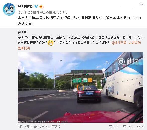 27日11:06分交警发布最新调查进度:举报人看错车牌导致调查方向跑偏,现在拿到高清视频,确定车牌为粤BRZ981!继续调查!