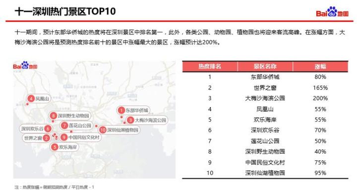 二是适合家庭出游的景区:东部华侨城、世界之窗、深圳湾公园、欢乐海岸、莲花山公园、深圳野生动物园、仙湖植物园、凤凰山、光明农场、观澜山水田园等周边区域,预计将从 每天9时至16时出现交通拥堵。