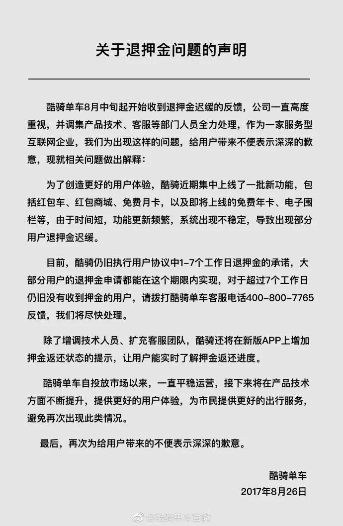 此前,自8月中旬用户反映押金问题后,酷骑官方微博先后发布了两篇回应:
