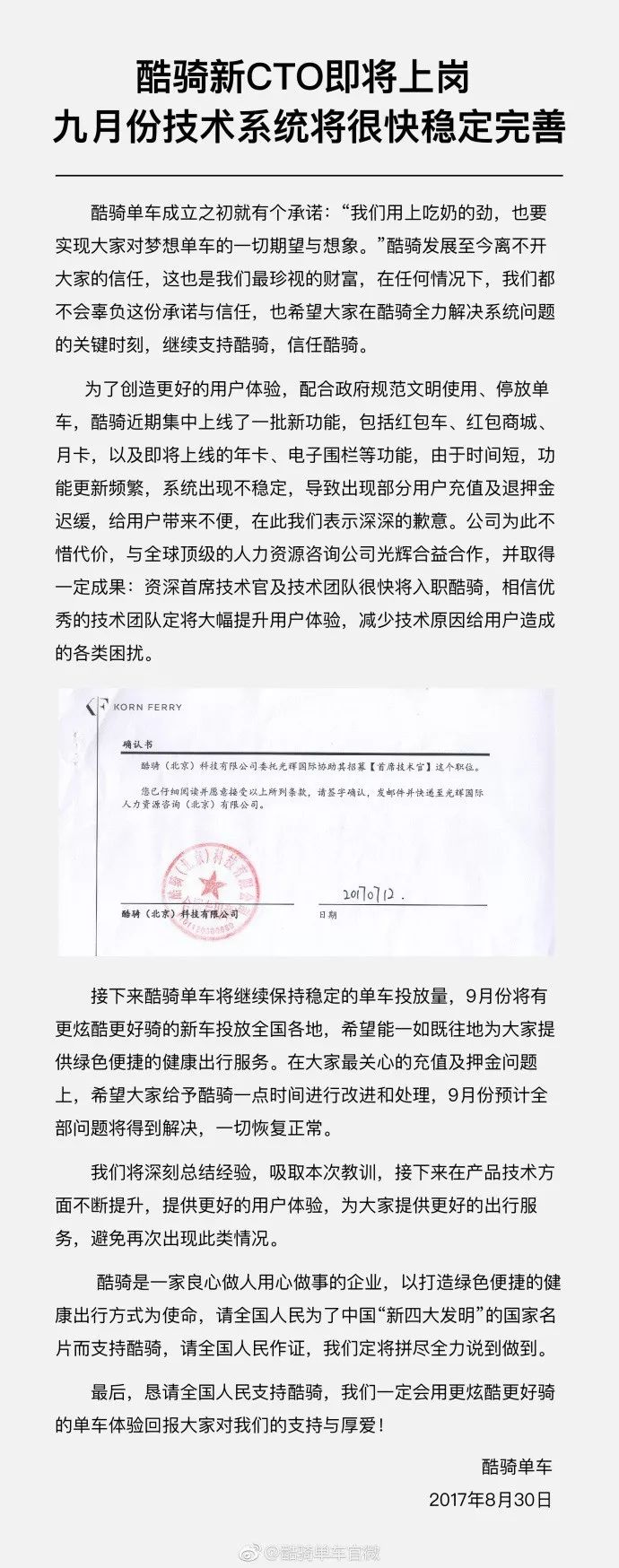8月30日,酷骑官方微博称,目前已更换公司CTO(首席技术官),技术系统将很快稳定完善,一切将恢复正常。