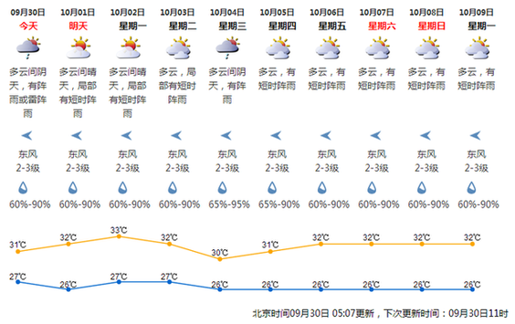 深圳新闻网9月29日讯(记者 刘梦婷)国庆将至,深圳天气如何?记者日前从深圳市气象部门获悉,国庆假期期间(10月1-8日)深圳以多云为主,间中有短时阵雨,天气炎热。