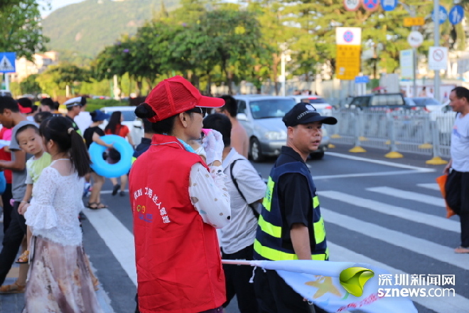 国庆期间,记者在大梅沙海滨公园采访发现,在人行道、公园入口、咨询室等人员密集处,总会发现“红马甲”和“蓝马甲”的身影,他们穿梭在人群当中,或帮助走失的小孩找回父母,或在路口维护秩序,或指导游客如何进行网上预约。