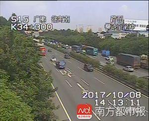 广佛高速往广州方向,泌冲站至北环沙贝站(K32+536)受北环高速广清路段车流大影响,现场交通缓慢;事件仍在进行中。【广佛监控中心】2017-10-08 14:13