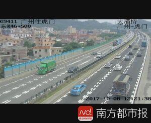 G9411广珠东高速往虎门方向,广珠东坦尾立交至虎门大桥南沙站(K46+500)受虎门大桥车流量大影响,现场交通缓慢;事件仍在进行中。