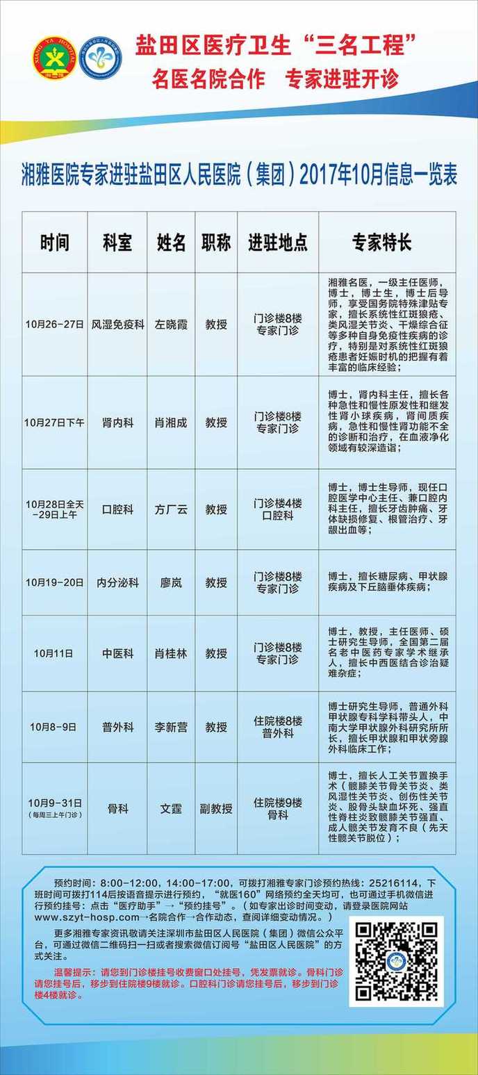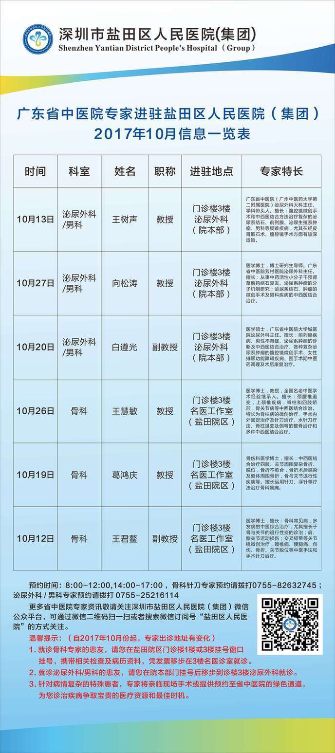 10月份 这些医疗专家进驻盐田人民医院为市民把脉问诊