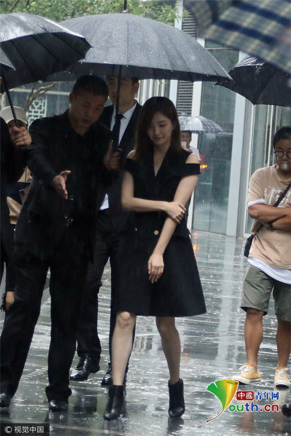 2017年10月9日讯,北京,近日,江疏影冒雨参加活动,当天雨下的非常大江疏影在众多黑衣安保的举伞护送下前行,由于近来天气寒冷,身着裙装的江疏影被冻的打起寒颤,只好抱臂暖和一下。