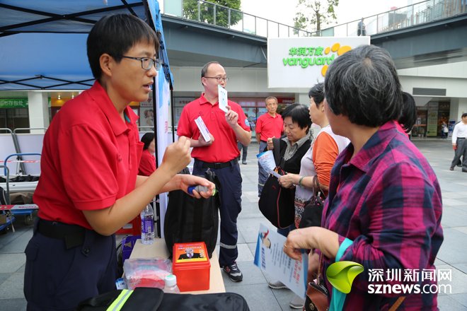 “胸外按压频率为每分钟100次至120次,一般按压30次做两次人工呼吸……”活动现场,多名身穿统一服装的工作人员向市民演示“徒手心肺复苏”的医疗急救方法。“第一响应人”热情地向市民介绍应急救护知识,系统讲解止血包扎、异物卡喉等常见突发事件第一时间的处置流程。