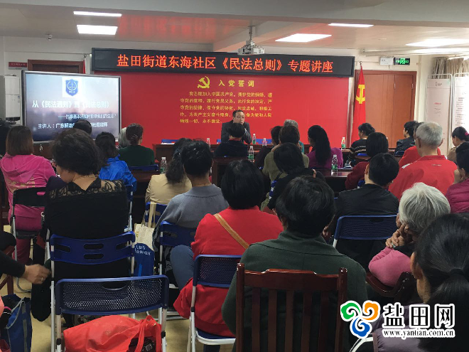 深圳新闻网讯(记者 陈蓉 通讯员 严晓静 徐晓华)为帮助辖区居民了解掌握《民法总则》相关内容,在生活中正确理解和运用《民法总则》。1月5日下午,盐田街道东海社区邀请了社区法律顾问杜煜,在社区党群服务中心开展《民法总则》——关于民事基本法如何影响我们的生活法律知识讲座专题活动,辖区内50余名居民参与了此次讲座。