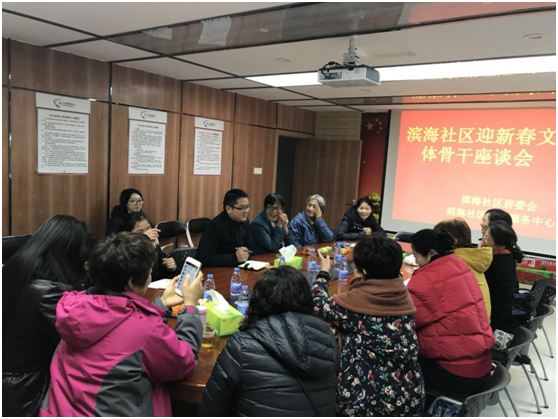 会议伊始,滨海社区居委会委员杨洪涛首先向一直以来热心参与社区文化活动的文艺骨干们表示衷心的感谢,并就去年社区开展的各项文艺活动情况进行了总结汇报,与会人员随后针对新一年的服务展开了热烈的讨论,大家纷纷献计献策,畅所欲言。杨主任鼓励社区文艺骨干继续发扬热心参与社区文化活动的奉献精神,并希望社区文化团队在新的一年里能够继续壮大,为丰富社区居民的文化生活贡献力量。