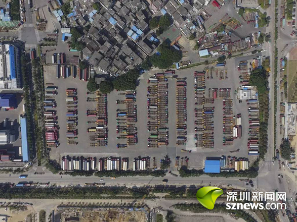 图为停满货柜车的公共货柜车临时停车场卫星图。