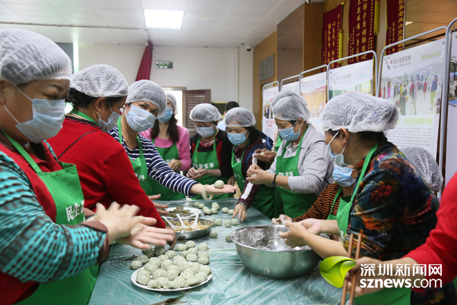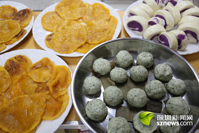 在田心社区工作站活动室内,两张桌子相对排开,居民们认真聆听指导老师的素食制作知识讲座,并动手制作艾叶钵、南瓜饼、紫薯卷和山药羹等家常素食。短短20分钟,一盘盘美味的素食就烹饪完成了,居民们齐聚一堂,一边品尝着健康素食,一边交流烹饪技巧,其乐融融。