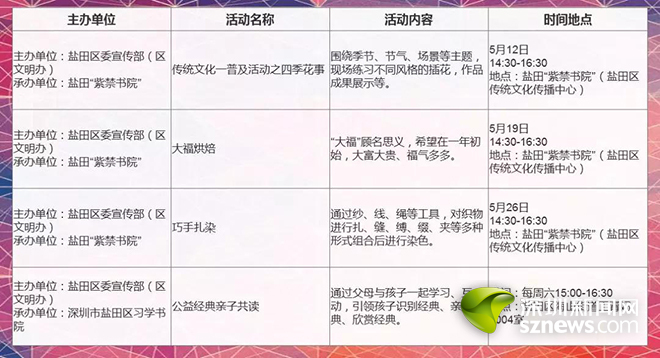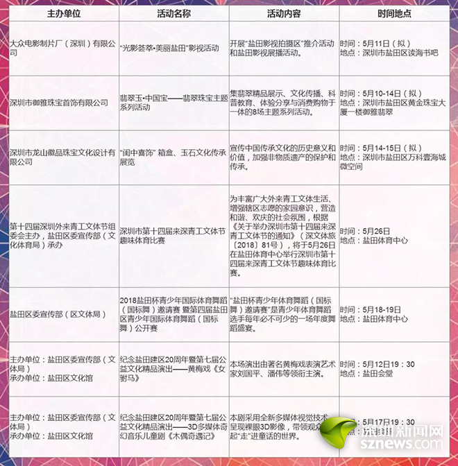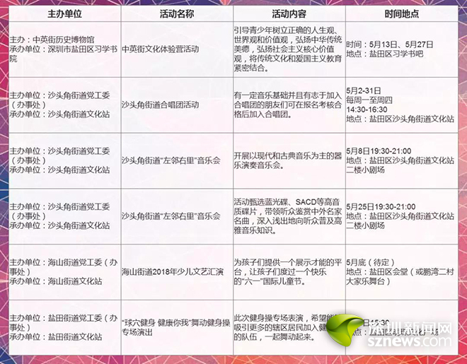 5月期间,盐田区将举办近50项文化演出、体验活动、展览等文体活动,使广大群众尽品“文化美食”,乐享“体育赛事”。