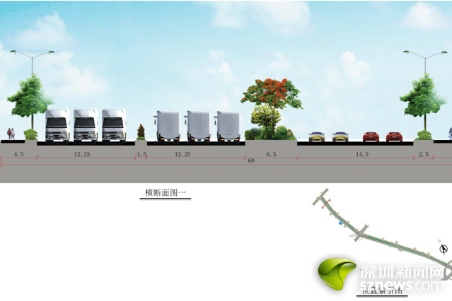据了解,明珠道主体工程全段均采用双向6车道+双向4车道的断面形式,物流区一侧(即西南侧)布置双向6车道货车专用道,生活区一侧(即东北侧)布置双向4车道客车专用道,中间采用立体绿化带进行隔离。客运通道规划时速为50Km/h,货运通道规划时速为40Km/h。根据道路设置要求、道路相交现况、规划道路功能以及地形条件,明珠道改造工程共设置2座桥梁,其中跨盐田路分离式立交桥1座,立交匝道桥1座。