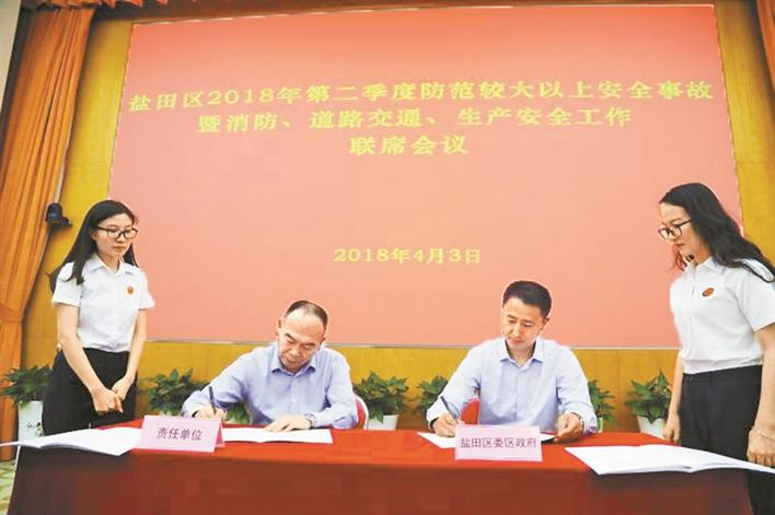 年初,盐田区安委办(区安监局)认真落实区委区政府安全生产工作的安排部署,落实与区安委会31家成员单位安全生产责任书的签订,明确目标,分解责任,齐抓共管,共同筑牢辖区安全防护屏障。