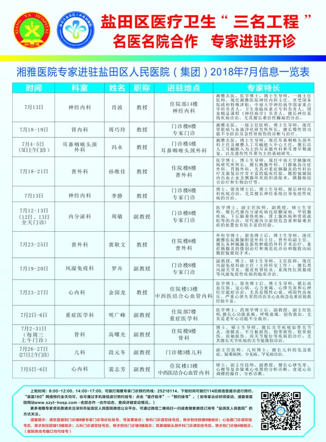​湘雅医院专家7月将进驻盐田区人民医院 市民可提前预约就诊