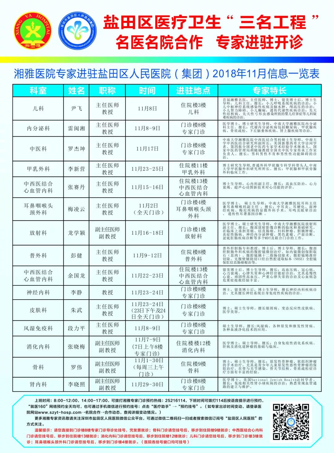 深圳新闻网讯(记者 杨春丽)近日,记者从盐田区人民医院(集团)获悉,11月份,15位来自湘雅医院的专家将进驻盐田区人民医院(集团),为市民的健康把脉问诊。市民可根据实际需求和专家出诊情况,通过电话、网站及手机微信公众号挂号等方式,提前预约就诊。