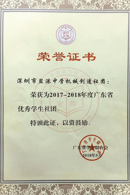 值得一提的是,盐港中学的“机械创造”社团与宝安中学、红岭教育集团、市科学高中等6个深圳市优秀学生社团一起被评为“2017-2018年度广东省优秀学生社团”,并名列第一。“入选省优秀学生社团要过五关斩六将,所以绝大部分入围社团都是广东省内各大高校,中小学社团要想入围是很难的。”盐港中学办公室副主任陈梦心老师告诉记者。
