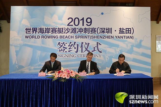 签约仪式现场首先播放了深圳盐田宣传片,向参会人员特别是国际赛艇联合会代表展示盐田优美的生态环境、丰富的旅游资源和得天独厚的地理位置。随后,与会领导共同签署了《2019年世界海岸赛艇沙滩冲刺赛(深圳•盐田)合作意向书》。相关代表方就赛事筹备情况进行汇报。据了解,盐田拥有19.5公里的黄金海岸线,旅游资源丰富;大梅沙海域举办过多次各类国际、国内A类大型赛事,充分具备举办海岸赛艇这一国际赛事的优势和能力。汇报还就大赛器材保障、酒店住宿、接送机服务、宣传推广、赛事后勤保障等几个方面的筹备工作作了简要介绍。据悉,明确授权后相关方将着手成立由国际赛艇联合会、中国赛艇协会和赛事组委会,并在国际赛艇联合会和中国赛艇协会的指导下,全面开展赛事筹备工作。同时,还将成立赛事属地后勤保障组,从场地、安保、消防、交通等各方面给予保障。
