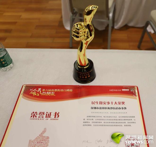 深圳新闻网讯(记者 郑创彬)1月3日下午,在第六届南都街坊口碑榜点赞礼上,梅沙街道荣获民生微实事十大金奖。梅沙街道党工委书记吴坤生应邀出席点赞礼并接受颁奖。据悉,这也是盐田区首次荣获此奖项。