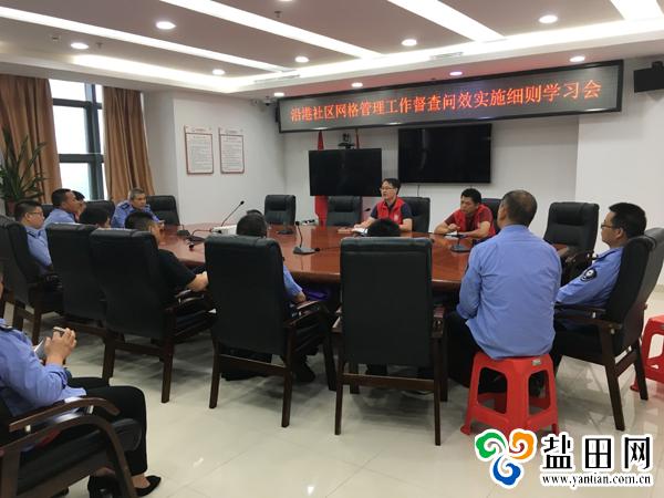 会议内容为学习《盐田街道网格管理工作督查问效实施细则(实行)》,站长首先宣读了文件内容,介绍了社区工作站站长、网格长、网格员在网格管理工作中的职责,评先评优的标准及奖励情形,绩效考核的内容及扣发的情形。