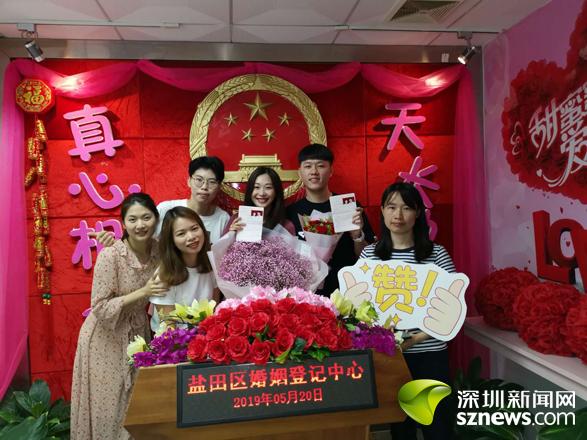 “今天是2019年5月20日,是你们喜结良缘的好日子。你们在茫茫人海中寻觅到对方,经相识、相知、相爱,一起牵手走进了婚姻的神圣殿堂,我衷心祝福你们钟爱一生,白头偕老。”盐田区民政局相关责任人作为当天特约嘉宾,为前来登记的新人们举行了简约庄重的颁证仪式。新人们顺利地领到“红本本”,在热烈祥和的气氛中完成了“终身大事”。