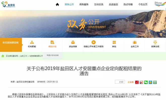 据悉,根据《深圳市保障性住房条例》《深圳市人才安居办法》及盐田区人才住房配租管理的有关规定,盐田区保障性住房管理中心于2019年5月21日发布了《关于面向2019年盐田区人才安居重点企业名录企业定向配租人才住房的通告》,并于2019年6月3日完成认租申请受理工作。经审核,符合条件的企业共34家,弃租4家。