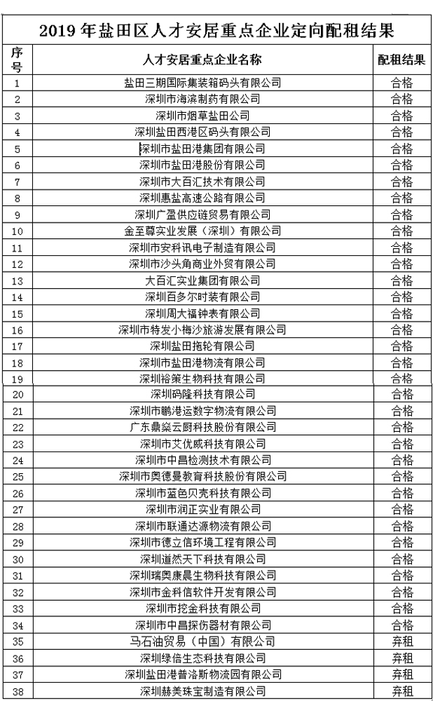 深圳新闻网讯(记者 陈琳君)2019年6月11日,盐田区住房和建设局公布盐田区2019年人才安居重点企业定向配租结果。经审查,符合2019年定向配租条件的企业共有34家。