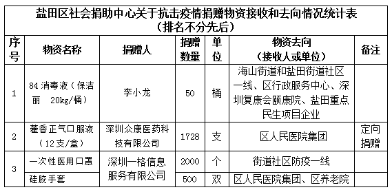 盐田区社会捐助中心将及时公布抗击疫情捐赠物资接收及分配情况,欢迎社会各界监督,联系人:韩民,13602621235。