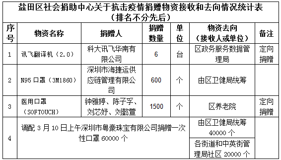 盐田区社会捐助中心将及时公布抗击疫情捐赠物资接收及分配情况,欢迎社会各界监督,联系人:韩民,13602621235。