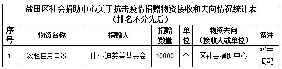 盐田区社会捐助中心将及时公布抗击疫情捐赠物资接收及分配情况,欢迎社会各界监督,联系人:韩民,13602621235。
