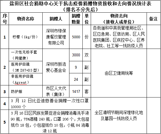2020年3月18日中午12时至3月20日中午12时,盐田区社会捐助中心接收到社会捐赠3批抗击疫情物资,分配5批,现将接收和分配情况公示如下: