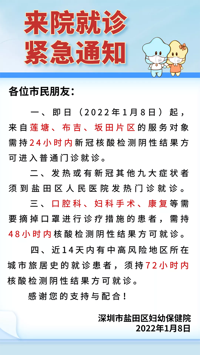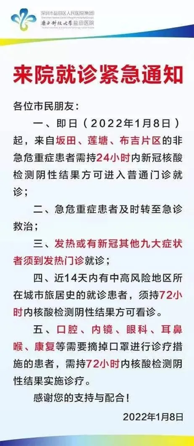 读特客户端•深圳新闻网2022年1月10日讯(记者 邓雪婷)1月8日,盐田区人民医院和盐田区妇幼保健院发布通知称,即日起,来自坂田、莲塘、布吉片区的非危重症患者需持24小时内新冠核酸检测阴性结果方可进入普通门诊就诊。