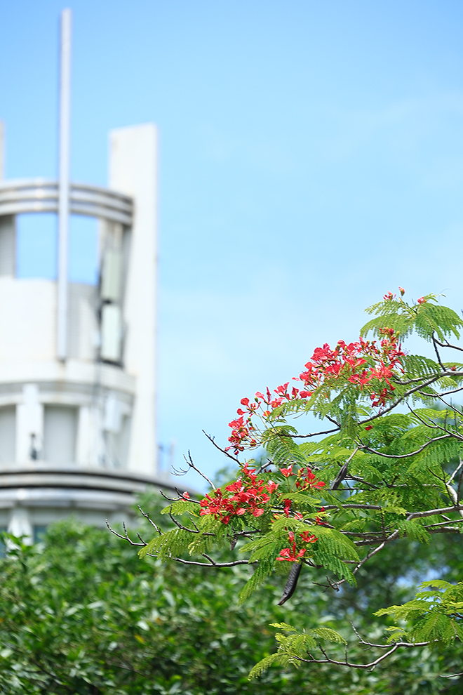 凤凰花与周边建筑和谐融合。