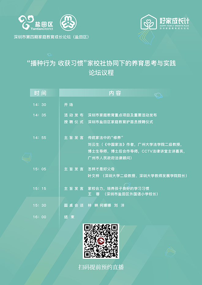 论坛面向全市家庭现场直播,@深圳家长们,您可以提前思考:学习习惯、家务劳动、父母身份的转换、关键期培养孩子养成好习惯等问题,以及您在家庭建设方面的好经验好做法。