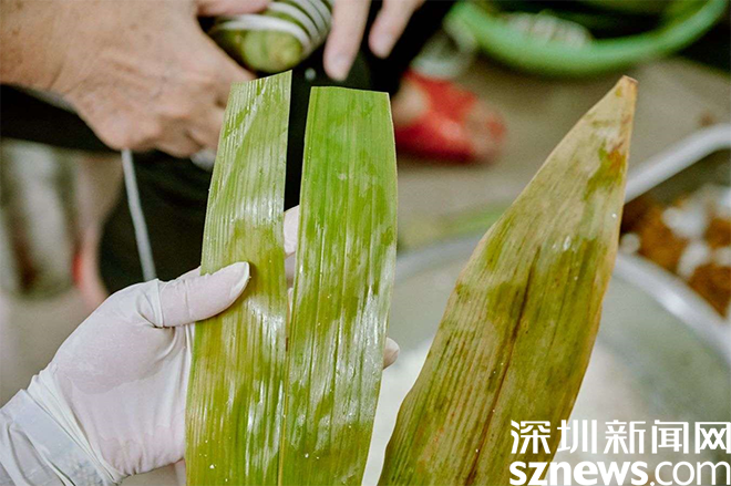 老一辈的梅沙村人会特地爬上当地最高的山——梅沙尖采摘粽叶。“那时候的山还是一座没有被开发的野山,都是土路,坡度陡峭,高直峻立。爬到顶峰采摘粽叶的都是勇者,山上布满荆棘,有许多的野生动物,遇到毒蛇也是常见之事。”大梅沙村的姐姐们告诉记者,梅沙粽用的粽叶是梅沙尖箬竹紫背粽叶,比其他的粽叶更加坚韧,在包的过程中不易撕烂,所以平时包粽子都会用梅沙尖的粽叶。