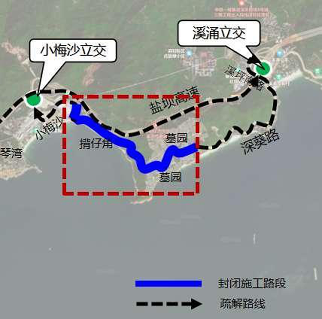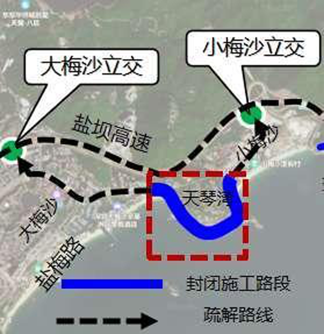 具体通行方面,2022年8月3日至2023年3月31日工作日期间,盐梅路(海鲜街至环梅路路段)封闭施工,原经此路段通行的车辆,可改沿北山道立交和大梅沙立交上盐坝高速或其他周边道路通行;2022年8月3日至2023年3月31日周末、法定节假日期间,盐梅路(海鲜街至环梅路路段)由双向通行调整为由东往西单向通行;2022年8月3日至2023年7月31日,盐梅路(小梅沙海洋馆至揹仔角沙滩停车场路段)封闭施工,原经此路段通行的车辆,可改沿小梅沙立交和溪涌立交上盐坝高速通行。