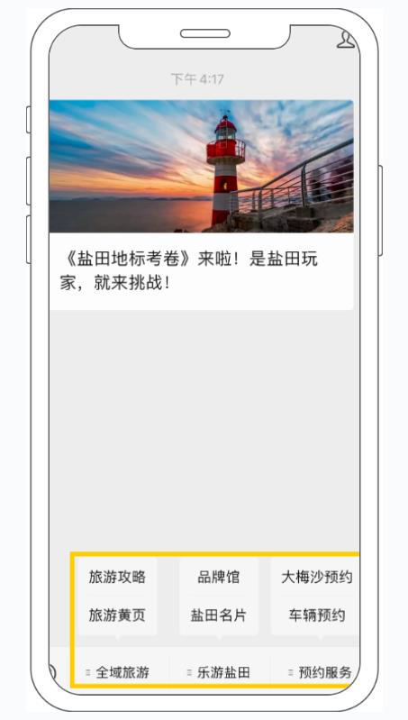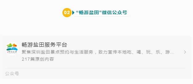 “畅游盐田”微信公众号内设全域旅游、乐游盐田、预约服务三大版块,拟打造“文旅资讯+景点推介+景区预约”为一体的智慧文旅平台。