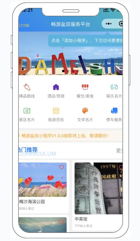 “畅游盐田”微信小程序聚焦深圳市盐田区景点预约与生活服务,内设精品路线、酒店民宿、景区名片、旅游资讯等八大版块,涵盖“吃、住、行、游、购、娱”多方面内容,为广大游客带来愉悦的旅游体验。