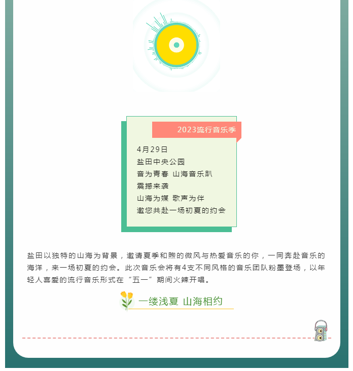届时,在我们的音乐趴周边还有城市放风计划,巨型风筝放飞表演和风筝手创体验等你来参与,与此同时还有“天空之伞”+“七彩风车”+“烟火集市”在山海盐田等待您的解锁,希望在五一假期为您带来不一样的感官体验。