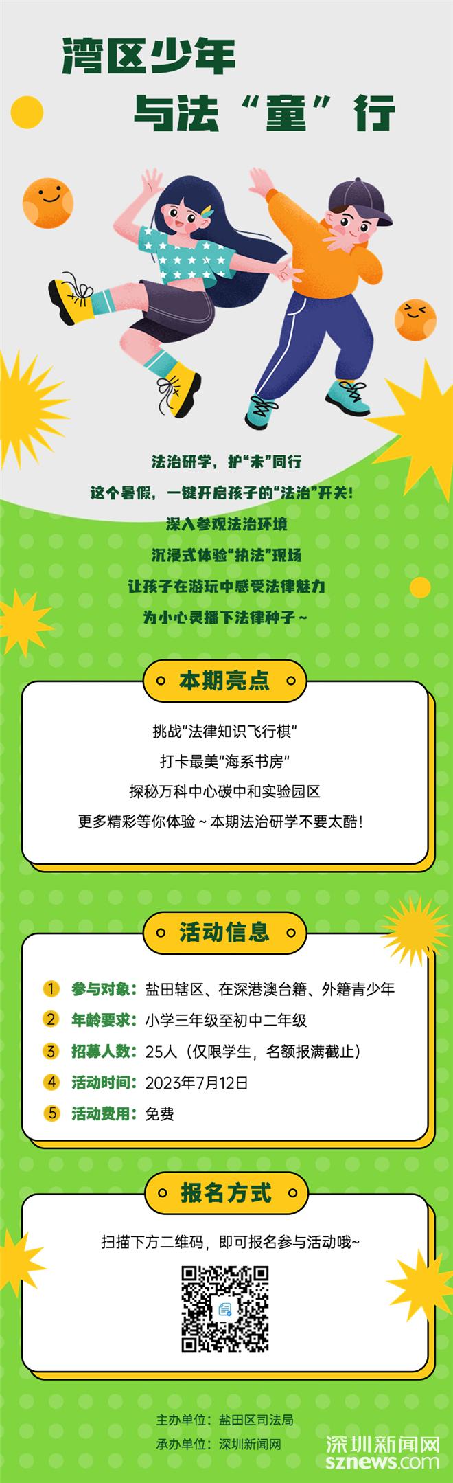 深圳新闻网2023年7月6日讯(记者 黎阳 实习生 蔡燕佳)挑战“法律知识飞行棋”、当一天“小法官”、打卡“海系书房”……为进一步探索“法治教育+研学体验”新模式,加强青少年法治教育,今年暑假期间,盐田区司法局将联合深圳新闻网推出“湾区少年与法‘童’行”法治研学活动。