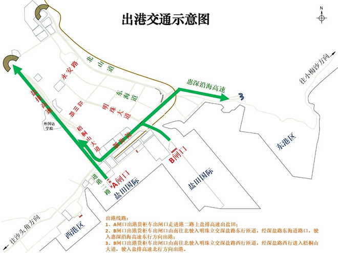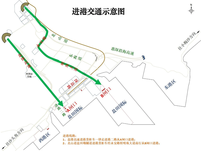 “由于盐田港后方陆域纵深有限,货柜车集中排队进港将对社会交通造成较大影响,同时也影响货柜车进港通行效率。”盐田港集疏港应急处置现场指挥部相关负责人介绍说,结合港区实际情况,所有进港车辆实行“由北向南”进港路线,并优化进港通道,将原本的“四进四出”调整为“两进三出”。其中,盐排高速由北向南进A闸,惠盐路-北山道-永安路-明珠道进B闸,“换而言之,车辆必须经过盐田坳隧道或盐田隧道才能进港,由坪山区、大鹏新区经坪盐通道、盐坝高速西行过来的车辆,也应按照前述交通组织在盐排高速或惠盐路排队进港。”该负责人表示。