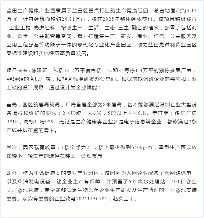 深圳市产业空间发展有限公司表示,盐田生命健康产业园是盐田区首个优质产业空间试点项目、盐田区首个“工业上楼”试点项目。项目总占地面积约4.14万平方米,计容建筑面积约为24.81万平方米,计划在2025年建成交付。项目集聚精准医疗及符合辖区产业导向的先进制造业,精准建链强链延链,助力盐田先进制造业园区高标准建设和实体经济高质量发展。园区方将为入园企业提供全维度的配套和资源。