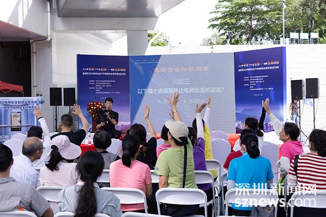 第三阶段为电梯安全知识有奖问答环节,以大屏出题、随机抢答的形式,激发社区居民们参与兴趣,现场气氛热烈。社区居民在轻松有趣的氛围中学习并掌握到电梯安全使用知识。