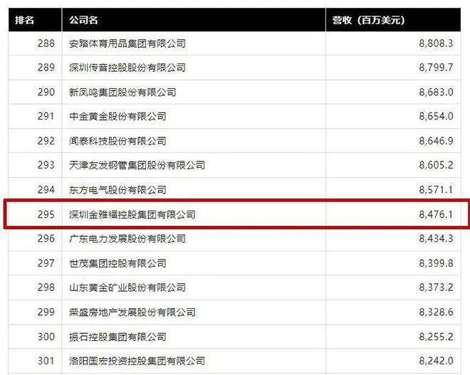过去一年,金雅福集团转型发展成绩斐然,位列总榜单第295位。