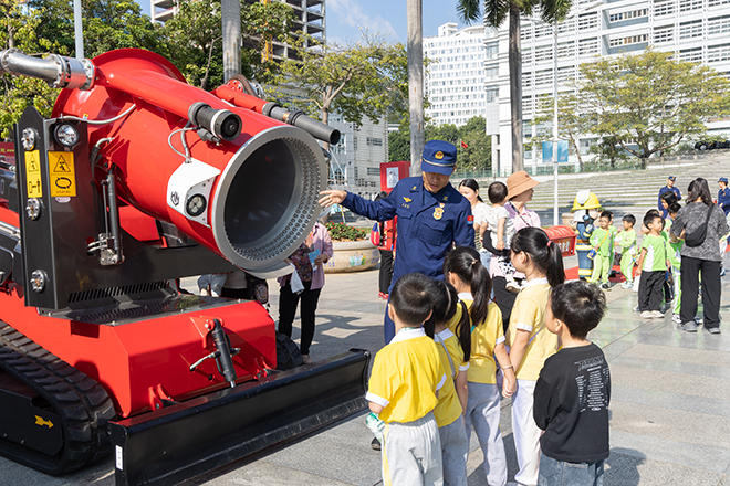 在盐田区行政文化中心广场,各式各样的消防器材整齐排列,从常见的灭火器到高科技的消防灭火系统等,一应俱全,为辖区群众提供了一次近距离接触和了解消防设备的机会。